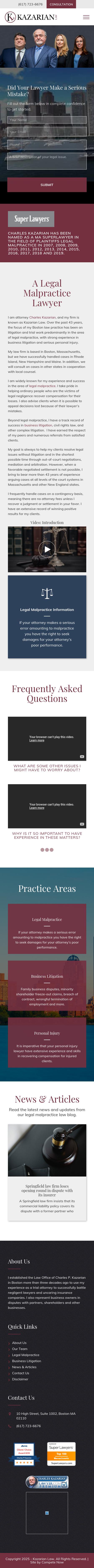 Charles P. Kazarian, Esq. Boston MA Business Litigation Lawyer | Personal Injury Attorney Massachusetts There is no cost for an initial telephone consultation with Boston legal malpractice attorney Charles Kazarian.