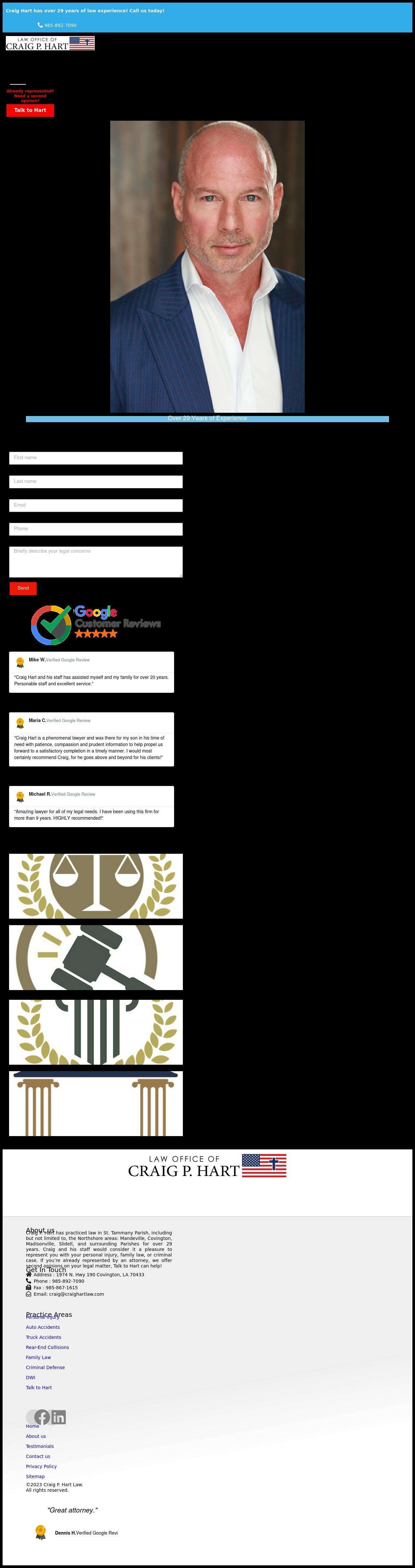 Law Office of Craig P. Hart Covington LA Criminal & Family Law Lawyer | Slidell Personal Injury Attorney | St. Tammany Parish Divorce, Accident Law Office For sound legal advice in Covington, Louisiana, concerning your family or criminal law matter, call the Law Office of Craig P. Hart at 800-210-8574.
